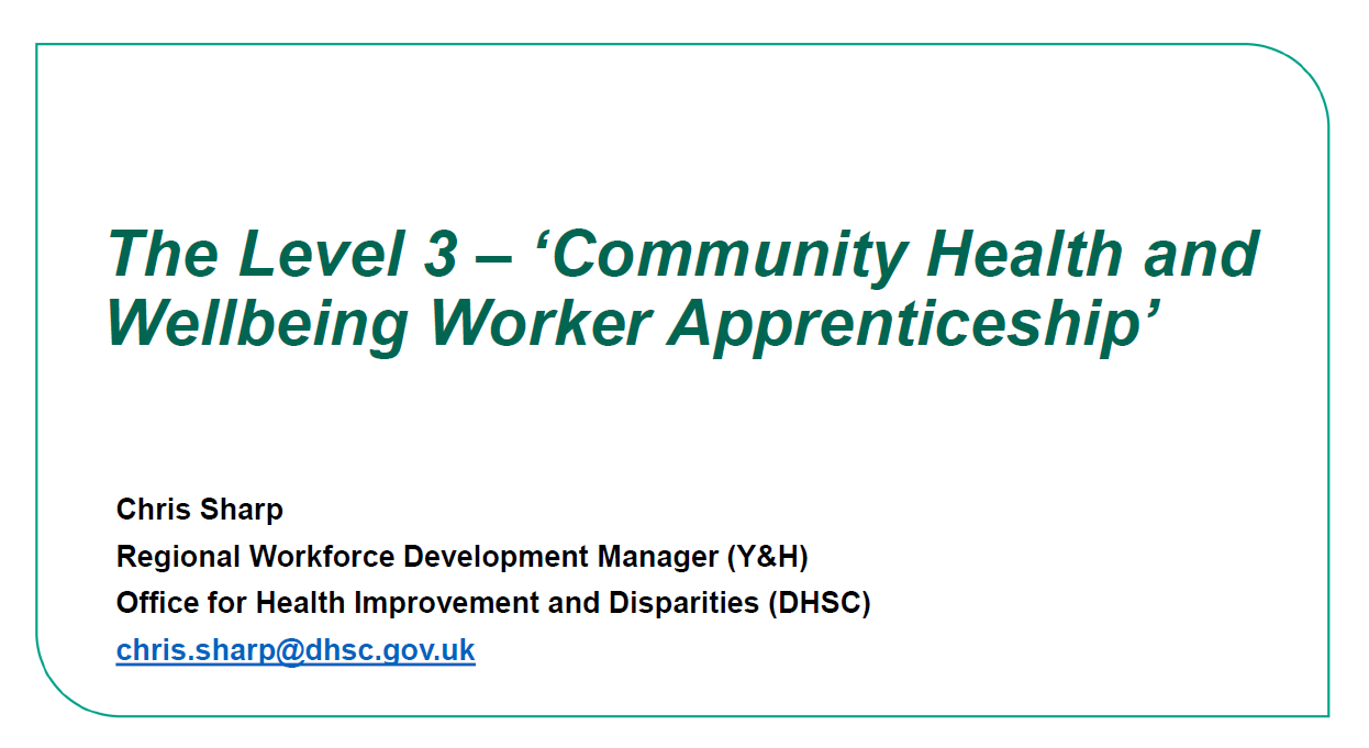 This Apprenticeship utilises the 'L3 Community Health and Wellbeing Worker Apprenticeship' standard to enable the Staff Wellbeing Champions to broaden their skills, scope and to apply the enhanced knowledge, skills and behaviours gained to benefit both staff and other contacts i.e. patients, service users and customers.