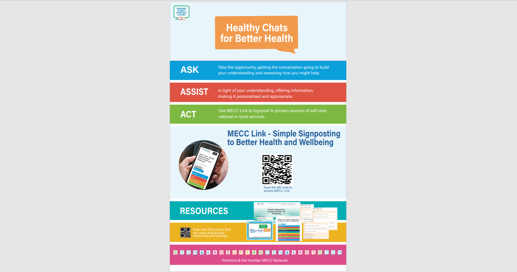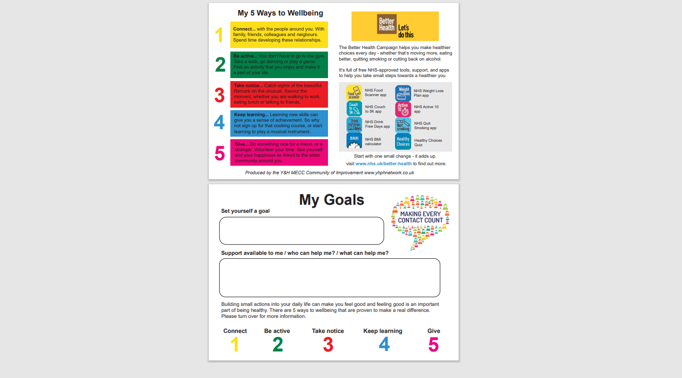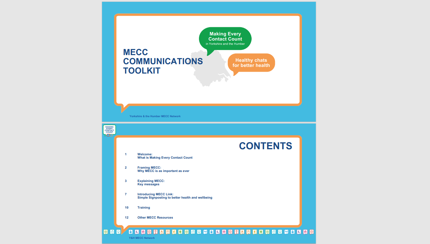 ‘MECC Link’ is a simple signposting tool, designed to support a social movement for health using the ‘Making Every Contact Count’ approach within Yorkshire and the Humber. ‘MECC Link’ includes simple and accessible signposting to a range physical and mental wellbeing interventions including self-care tools/resources and sources of support from local and national services.
