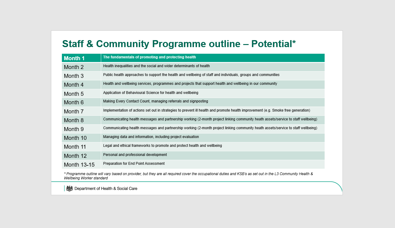 This Apprenticeship utilises the 'L3 Community Health and Wellbeing Worker Apprenticeship' standard to enable the Staff Wellbeing Champions to broaden their skills, scope and to apply the enhanced knowledge, skills and behaviours gained to benefit both staff and other contacts i.e. patients, service users and customers.